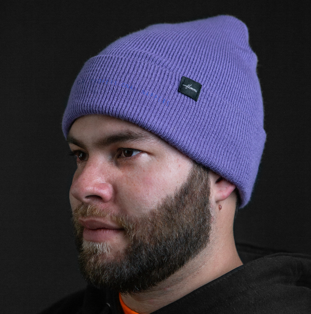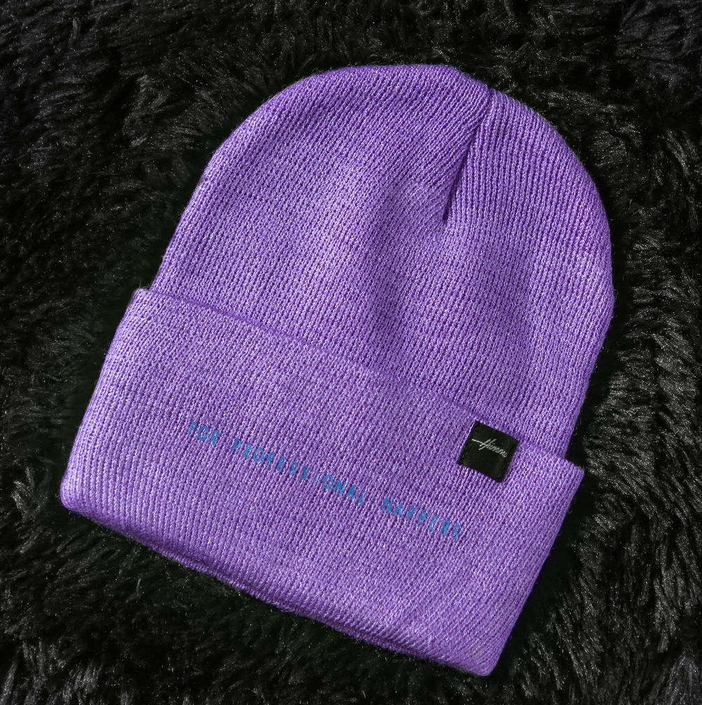 GORRO TEJIDO COLOR MORADO CON VINIL AZUL «FOR PROFESSIONAL NAPPERS» Y ETIQUETA DE LA MARCA