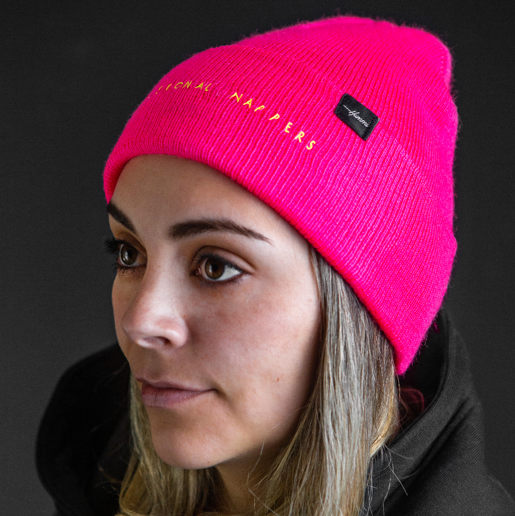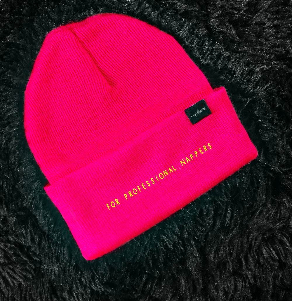 GORRO TEJIDO COLOR ROSA NEÓN CON VINIL AMARILLO «FOR PROFESSIONAL NAPPERS» Y ETIQUETA DE LA MARCA