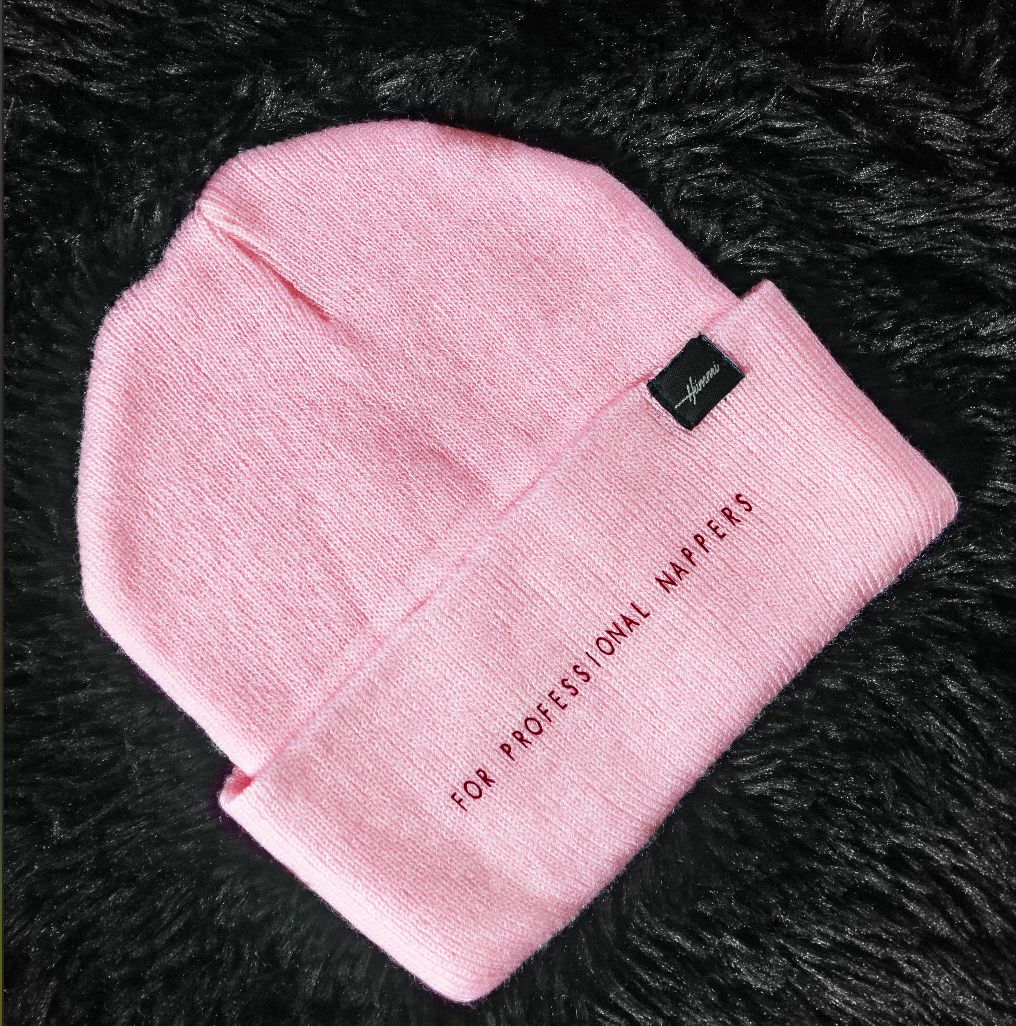 GORRO TEJIDO COLOR ROSA CLARO CON VINIL VINO «FOR PROFESSIONAL NAPPERS» Y ETIQUETA DE LA MARCA